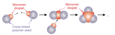 By tuning the synthesis conditions, we can control the number of protrusions appearing on the surface of highly cross-linked polymer spheres. High particle yields above 90% are achievable. We employed the technique for polyNIPAM, polystyrene, and magnetite filled polyNIPAM spheres. Partial roughness is achieved through adsorption of secondary particles, or wrinkling of the seed particle surface. (Kraft et al., JPCB (2011))